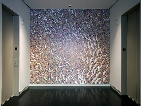 The design of the wallpaper located in each elevator lobby was generated using scripts that produced a randomized background triangle pattern. IAC logos flock in the foreground, shifting and migrating between the nine elevator lobbies.