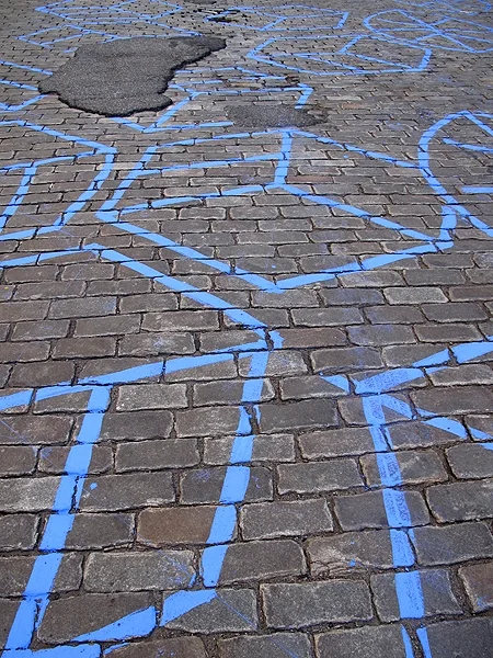 Between the site of an old box and tobacco factory rests a large patchwork of cobblestones and asphalt. Our intervention utilized a chalk and water mixture to create geometric patterns of boxes between the patchwork of roadway strata.