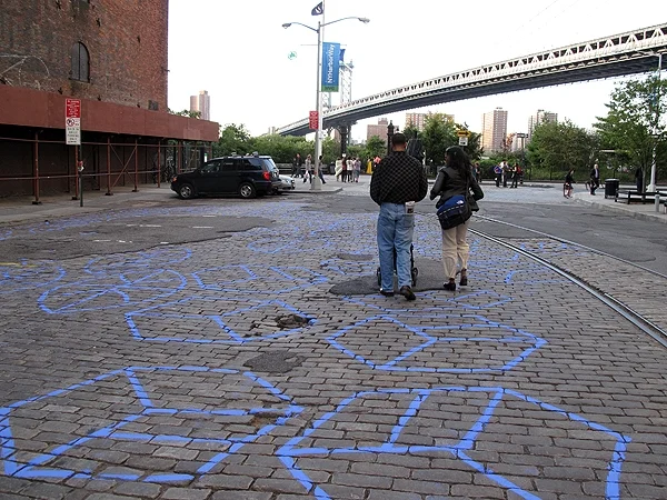 Between the shadows of the Manhattan and Brooklyn bridges lies a post industrial neighborhood known as DUMBO. The Roads are layered with time and reveal a thin geologic strata scared by heavy use, erosion and deterioration. Asphalt patches yield themselves to forgotten sidewalks, rail lines and vast expanses of pitted cobblestone streets. Walking across these spaces is like walking back in time, the industrial history of this neighborhood is palpable.