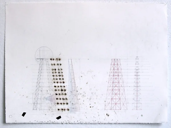 Repetitive drawings of identical towers with unique burn marks stand relentlessly organised and progress with time. Beneath each row, rendered in non-photo blue - are inappropriate and discriminatory comments said during the career of a female architect across multiple cultures. Running like an undercurrent which seeks to undermine her qualifications, authority, agency, intelligence and power, the non-photo blue cannot be reproduced, and is invisible to cameras, therefore not recorded and not believed.
